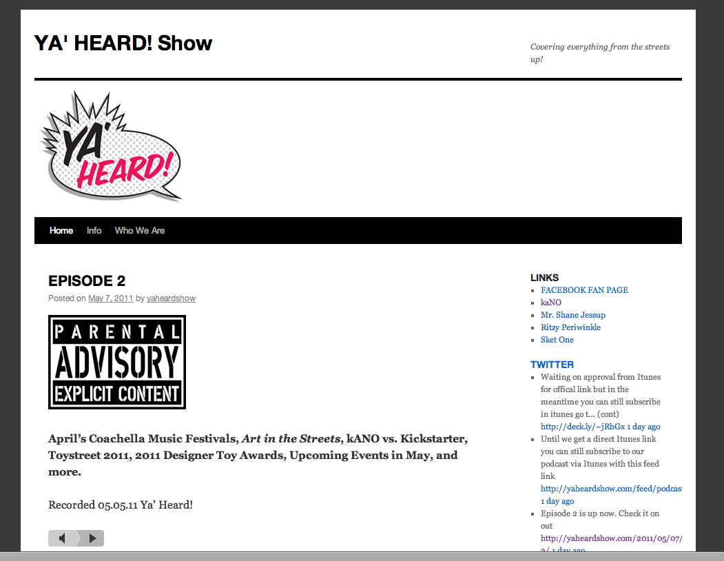 Correct, episode 2 of Ya’ Heard Show podcast is now up kiddies! I talked about how it all started here. Even though we have all been swamped we some how made it happen. Our main topic of the show is the MOCA Art in the Streets exhibit. I think the sound quality is waaay better this time around. We tried a new method and I think its the move from now on. Check it out and let us know what you think. Once we get our groove and a few more under our belt then we are thinking we’ll finally have special guests to join the discussion.